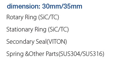 dimension: 30mm/35mm Rotary Ring (SiC/TC) Stationary Ring (SiC/TC) Secondary Seal(VITON) Spring &Other Parts(SUS304/SUS316)