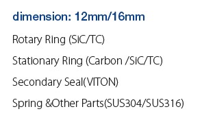 Rotary Ring (SiC/TC) Stationary Ring (Carbon /SiC/TC) Secondary Seal(VITON) Spring &Other Parts(SUS304/SUS316)