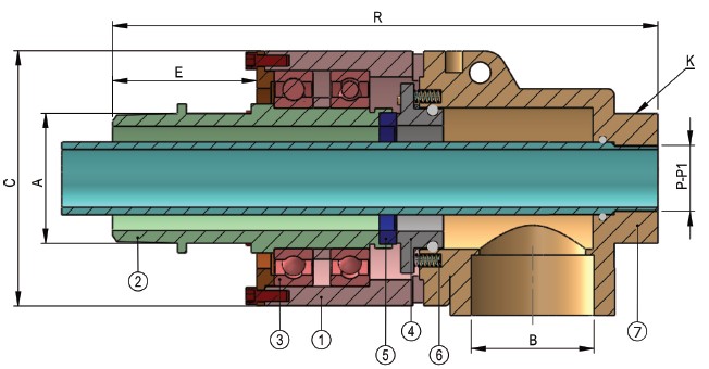 1. Upper Body 2. Rotary Pipe 3. Bearing 4. Stationary Ring 5. Rotary Ring 6. Spring 7. Lower Body