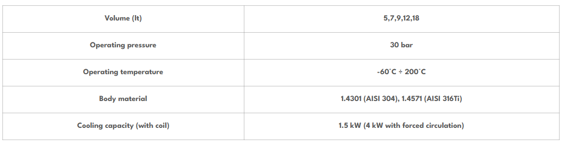 Стандартные соединения из нержавеющей стали, манометр из нержавеющей стали, сварной прозрачный индикатор уровня с боросиликатным стеклом и предохранительный клапан из нержавеющей стали. Доступен с рядом дополнительных принадлежностей, включая заправочный блок и охлаждающий змеевик.