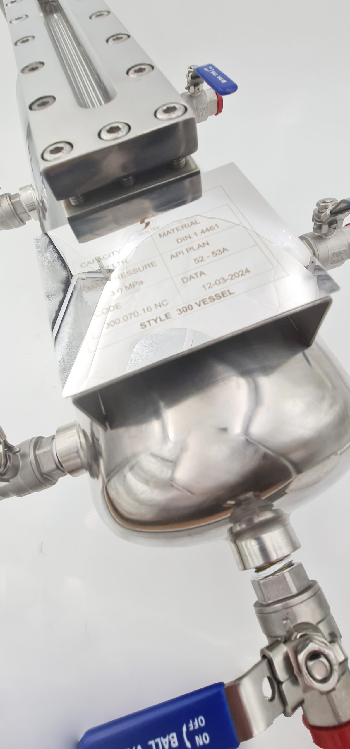Резервуар для буферной/барьерной жидкости для двойных механических уплотнений, изготовленный в соответствии со стандартами ASME и PED для применения в рамках плана API 53.